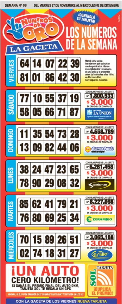 Como cada miércoles, se publicó la grilla completa de los Números de Oro de LA GACETA para que los lectores puedan revisar sus tarjetas. Aquellos que completen los 15 números de una de las grillas de su cartón de Números de Oro deberán presentarse en calle Mendoza 654 hasta las 18, que cierra la semana número 6 de Números de Oro. En caso de que el ganador sea usuario Tarjeta Sol, duplica el premio.