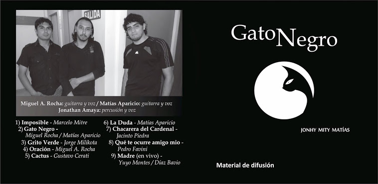 Aires de retumbo florecen en tres voces y salen a cantarle a la luna: “la noche se roba se roba mi caja chayera y le miente al mundo una luna llena. La noche coplera golpea mi pena, el cuero de mi alma más fuerte se tensa...” Jonathan Amaya, Miguel Rocha y Matías Aparicio conforman Gato Negro, trío de jóvenes tucumanos, que recientemente ha sacado del horno su primer cedé. El registro está integrado por 14 piezas, una docena de ellas compuestas por Aparicio y Rocha, y las restantes pertenecen Carlos y Juan Carabajal (Corazón verdugo) y a Marcelo Mitre y Saúl Carabajal (Imposible). Cuentan con el aporte de Luis Heredia (guitarra), Víctor Juárez (bandoneón), Marcos Nogales (batería), Lucas Ale (bajo), Antonio Perea (bombo), Jesús Cortés (teclados) y Frank Gramajo (percusión). A tono con el folclore llamado joven, el amor recorre la mayor parte del repertorio. Voces frescas, afinadas, armoniosas, arreglos modernos y cuidados son algunos rasgos salientes del grupo. “La noche va arriando la nostalgia, el alma de mi pecho se desata, dónde andarás ahora amaneciendo mi sueño en otro cielo”, canta Gato Negro.