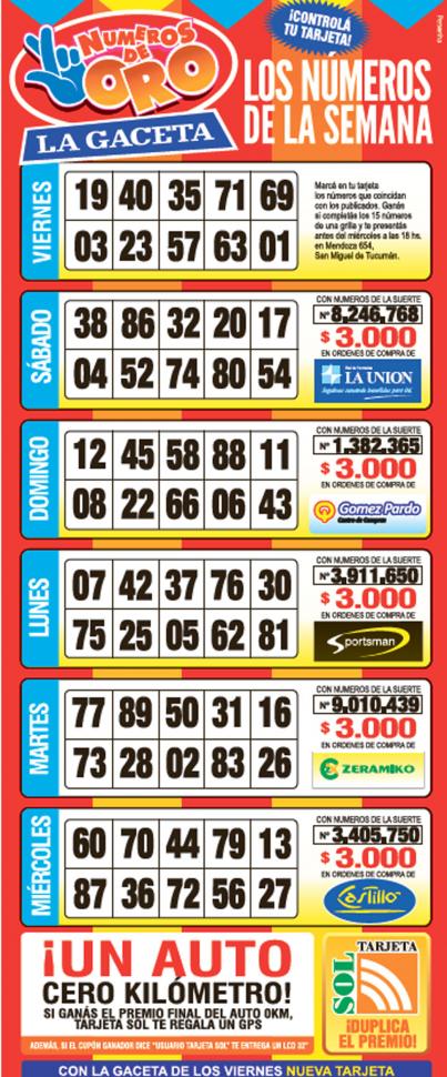 Como cada miércoles, se publicó la grilla completa de los Números de Oro de LA GACETA para que los lectores puedan revisar sus tarjetas. Aquellos que completen los 15 números de una de las grillas de su cartón de Números de Oro deberán presentarse en calle Mendoza 654 hasta las 18, que cierra la semana número 9 de Números de Oro. En caso de que el ganador sea usuario Tarjeta Sol, duplica el premio.