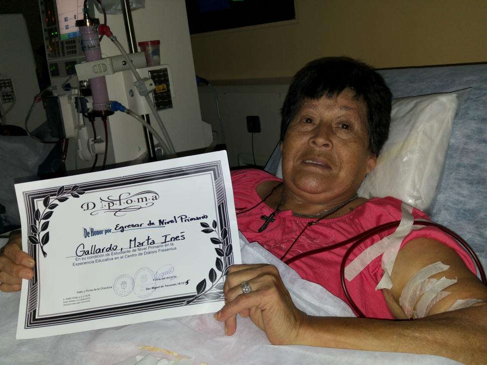 Habría tenido ocho años cuando ya andaba pelando caña con su padre y sus ocho hermanos. Ya estaban acostumbrados a ver el amanecer en el campo. Al mediodía, llegaba su madre con la comida y se sentaban ahí nomás, en el cerco, recuerda Marta Gallardo, 60 años después. Está recostada en uno de los sillones de diálisis del Instituto Fresenius Medical Care. Cuatro horas seguidas. Tres veces a la semana. En sus manos sostiene con cuidado un tesoro que jamás hubiera pensado conseguir, y mucho menos en un instituto de diálisis: su diploma de terminalidad del nivel primario. Sonríe satisfecha.