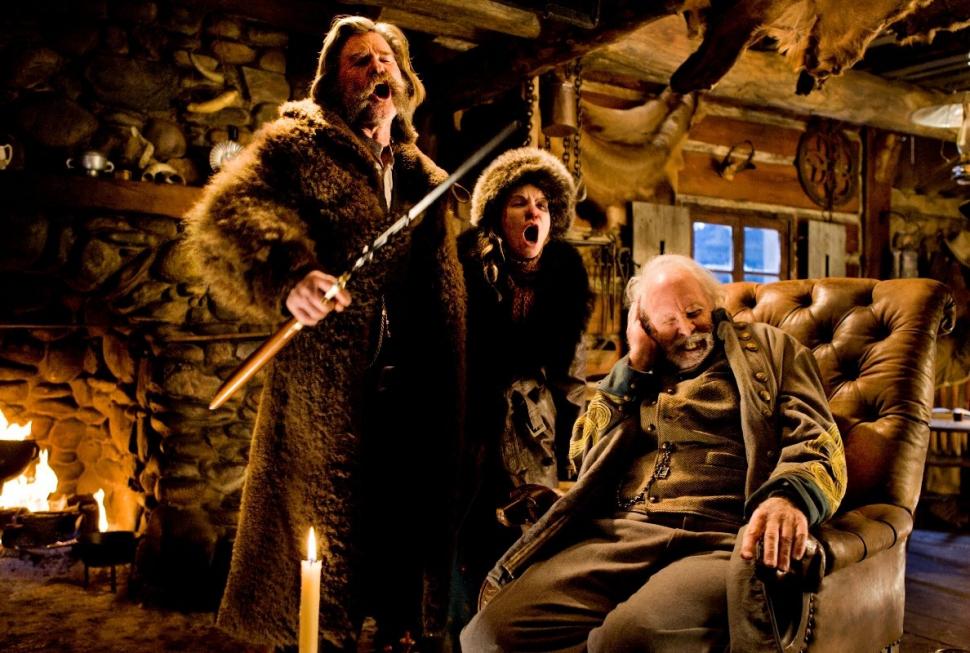 Si bien este comienzo puede recordar en algún punto al clásico de John Ford “La diligencia” (1939) (en el que varios extraños están obligados a viajar juntos un largo trayecto pese a sus diferencias y la desconfianza que cada uno despierta en el otro), Tarantino toma inmediatamente otro rumbo cuando los viajeros buscan refugio de un temporal en un gran almacén solitario. Allí los espera un grupo de asesinos que pretende liberar a Domergue, hermana del líder de la banda.