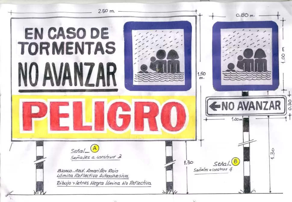 Con relación a la carta publicada en este diario de fecha 13/1/2016, de los señores Pedro Martínez y Víctor Guardia, referida al deficiente estado de la señalización del puente Lucas Córdoba, quiero felicitar a los mismos por su inquietud y preocupación. Yo también me sumo a estos amigos para aportar mi granito de arena y lo hago como ex Jefe de la Señalización de la Dirección Provincial de Vialidad para decir: con todo respeto, salvo mejor criterio de técnicos y profesionales en la materia, que la zona en cuestión es muy peligrosa y de características muy especiales. Digo esto porque únicamente tiene triángulo de visibilidad en la calle 24 de Septiembre de oeste a este, no así las calles Bernabé Aráoz de sur a norte, como así también Marco Avellaneda de norte a sur. Lo mismo en calle San Luis, que también ingresa por 24 de Septiembre. Las mismas se encuentran de golpe con un problema en caso de tormentas. Es por lo manifestado que no aconsejo señales cargadas de leyendas. Según mi opinión, en ese lugar se deberían colocar señales impactantes, pero sin apartarse de las normas vigentes. Las mismas deberían tener cinco colores: blanco, amarillo, azul y rojo (láminas autoadhesivas grado ingeniería o alto impacto, o similar), negro (lámina autoadhesiva no reflectiva). Las mismas deberán ser estampadas sobre chapa de 1/8 de espesor, chapa común negra o similar de aluminio. Sobre parantes de madera dura (cebil o nogal, o similar caño de hierro). Para mejor ilustración de lo manifestado, adjunto dibujo del formato y colores de las señales a construir, medidas y materiales a utilizar, como así también, acompaño un croquis de ubicación de los mismos (salvo mejor criterio). Solamente he querido colaborar y al mismo tiempo aportar mi experiencia de más de 30 años elaborando señales.