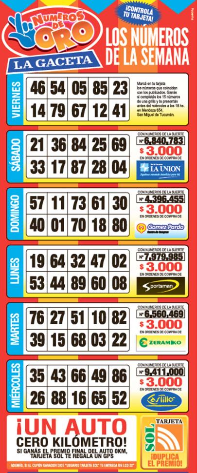 Como cada miércoles, se publicó la grilla completa de los Números de Oro de LA GACETA para que los lectores puedan revisar sus tarjetas. Aquellos que completen los 15 números de una de las grillas de su cartón de Números de Oro deberán presentarse en calle Mendoza 654 hasta las 18, que cierra la semana número 22 de Números de Oro. En caso de que el ganador sea usuario Tarjeta Sol, duplica el premio.