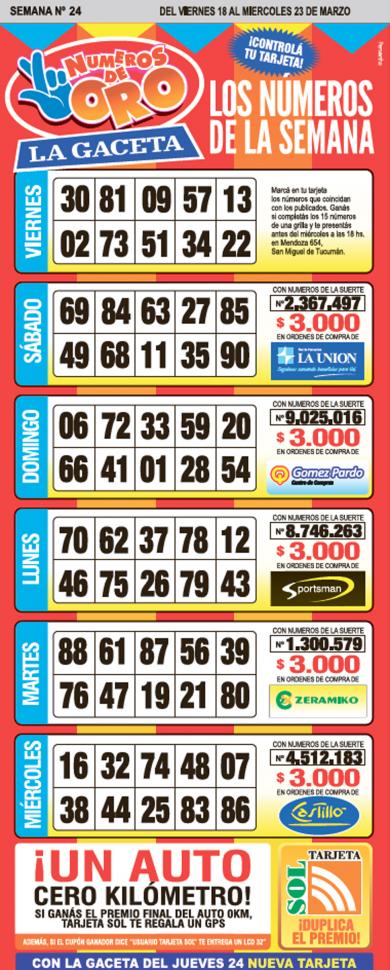 Como cada miércoles, se publicó la grilla completa de los Números de Oro de LA GACETA para que los lectores puedan revisar sus tarjetas. Aquellos que completen los 15 números de una de las grillas de su cartón de Números de Oro deberán presentarse en calle Mendoza 654 hasta las 18, que cierra la semana número 24 de Números de Oro. En caso de que el ganador sea usuario Tarjeta Sol, duplica el premio.