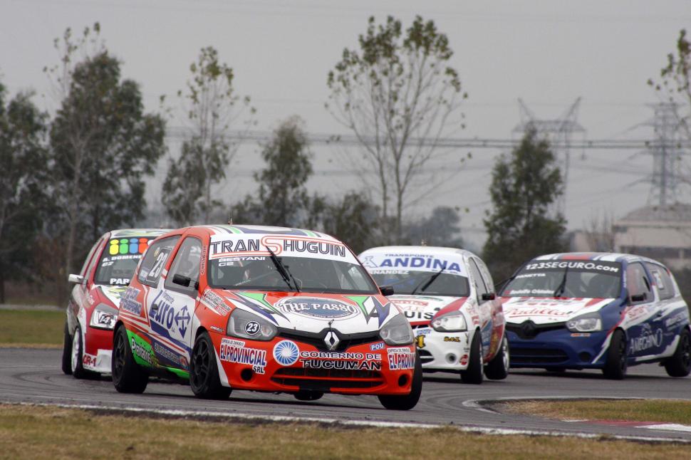 SÓLIDO. Maximiliano Bestani transita con su Renault Clio a toda velocidad por la pista del “Roberto Mouras”, con varios rivales persiguiéndolo muy de cerca. prensa maximiliano bestani
