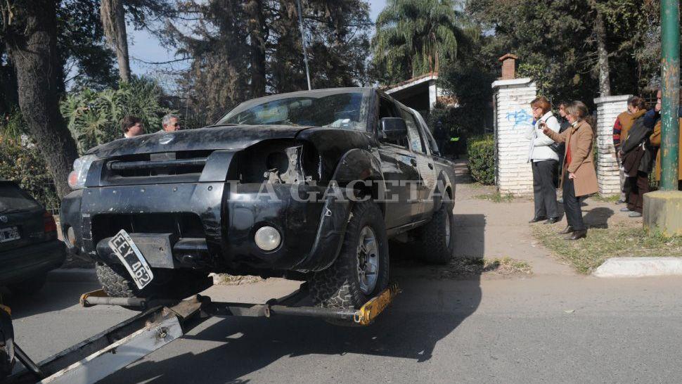 INDICIOS DE UN IMPACTO. La camioneta negra tiene dañada la trompa y manchas de sangre. Familiares de Pucheta observan el procedimiento.