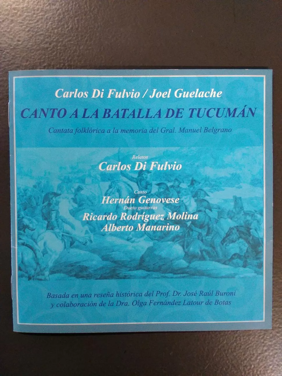 Sin su desobediencia ni la determinación de los tucumanos que decidieron jugarse el pellejo con él, tal vez los argentinos hubiésemos seguido siendo colonia de España durante mucho tiempo más. Carlos Di Fulvio, uno de los destacados creadores del folclore, toma la figura de Manuel Belgrano y junto a Joel Guelache, le dedica una cantata, integrada por 12 números con relatos. Se basó en escritos de José Buroni y contó con la colaboración de Olga Fernández Latour de Botas. Milonga, cielito, vidala, huayno, gato, fantasía, triunfo, marcha y zamba habitan musicalmente este “Canto a la Batalla de Tucumán”, interpretado por Hernán Genovese (canto), Ricardo Rodríguez Molina y Alberto Manarino (guitarras) y Di Fulvio (relatos). La obra comienza cuando el creador de la Bandera asume como jefe del Ejército del Norte, impulsa luego el Éxodo jujeño y derrota a los realistas en Tucumán. Un trabajo valioso del autor de la chacarera “Campo afuera”, que bien merecería llegar a las escuelas.