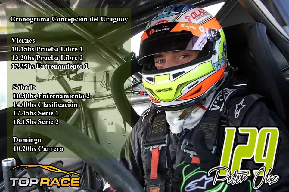 Peter Olaz tiene todo para volver con una sonrisa desde Concepción del Uruguay. Es que, además de haber ganado en el circuito entrerriano, en la novena fecha del Top Race Series, última de la Etapa Regular, salvo una catástrofe no podrá llegar a los play offs a los que clasifican los ocho mejores. Olaz llega en el séptimo puesto del campeonato, donde cuatro de sus antecesores ya consiguieron victoria con lo que está virtualmente clasificado. El cronograma prevé actividad el viernes con el primer ensayo además de las dos tandas de pruebas libres, el sábado será el segundo entrenamiento previo a la clasificación y las series que determinarán el orden de partida de la final del domingo.