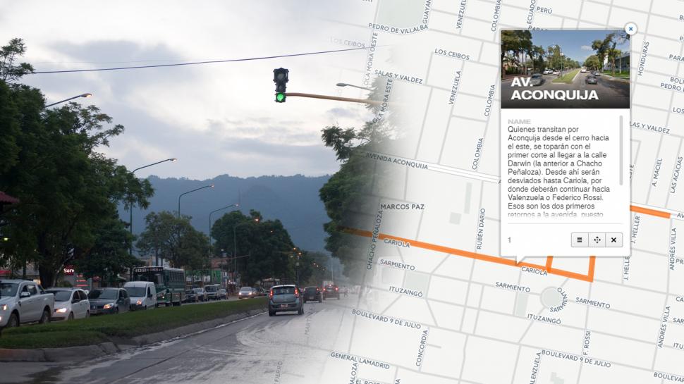 - Quienes transitan por Aconquija desde el cerro hacia el este, se toparán con el primer corte al llegar a la calle Darwin (la anterior a Chacho Peñaloza). Desde ahí serán desviados hasta Cariola, por donde deberán continuar hacia Venezuela o Federico Rossi. Esos son los dos primeros retornos a la avenida, puesto que el acceso por Rubén Darío también está interrumpido.