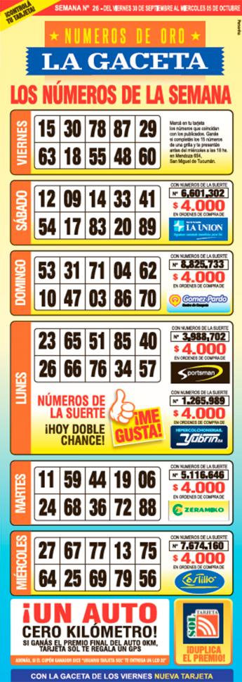 Como cada miércoles, se publicó la grilla completa de los Números de Oro de LA GACETA para que los lectores puedan revisar sus tarjetas. Aquellos que completen los 15 números de una de las grillas de su cartón de Números de Oro deberán presentarse en calle Mendoza 654 hasta las 18, que cierra la semana número 26 de Números de Oro. En caso de que el ganador sea usuario Tarjeta Sol, duplica el premio.