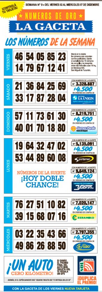 Como cada miércoles, se publicó la grilla completa de los Números de Oro de LA GACETA para que los lectores puedan revisar sus tarjetas. Aquellos que completen los 15 números de una de las grillas de su cartón de Números de Oro deberán presentarse en calle Mendoza 654 hasta las 18, que cierra la semana número 9 de Números de Oro. En caso de que el ganador sea usuario Tarjeta Sol, duplica el premio. Hace cinco semanas que viene vacante, por lo que el pozo acumulado es de 300.000.