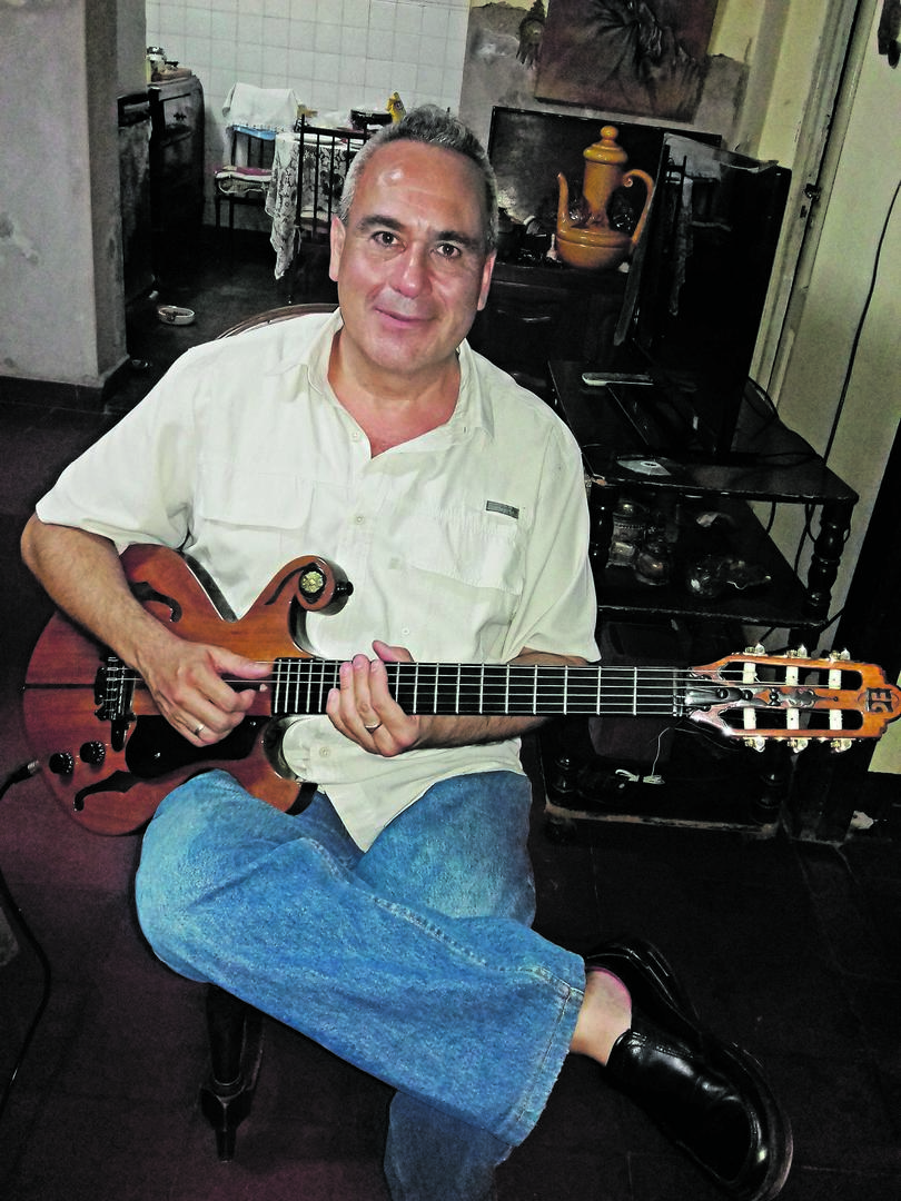 INTÉRPRETE Y CONSTRUCTOR. Enrique Grimberg empuña su guitarra eléctrica con cuerdas de nylon.