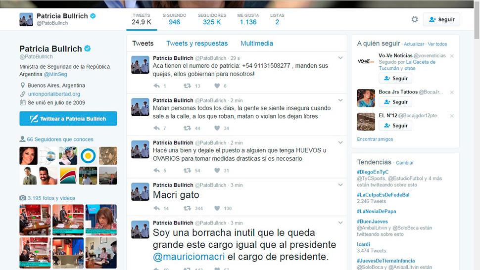 Una serie de tuits que aparecieron en la cuenta oficial de la Ministra de Seguridad de la Nación, Patricia Bullrich, causaron sorpresa durante la siesta. En ellos, la ministra presentó su renuncia, atacó al presidente Mauricio Macri y finalmente divulgó su propio número de teléfono. Se trató de un hackeo a la cuenta de la funcionaria.