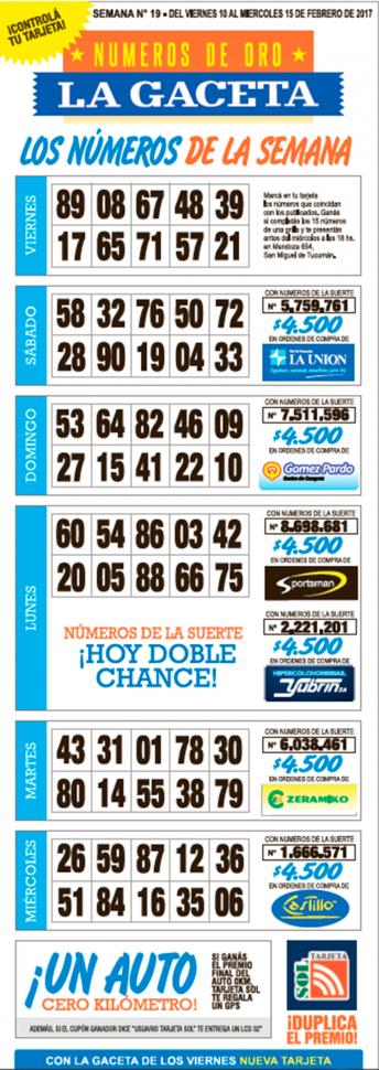 Como cada miércoles, se publicó la grilla completa de los Números de Oro de LA GACETA para que los lectores puedan revisar sus tarjetas. Aquellos que completen los 15 números de una de las grillas de su cartón deberán presentarse en calle Mendoza 654 hasta las 18, que cierra la semana número 19 de Números de Oro. En caso de que el ganador sea usuario Tarjeta Sol, duplica el premio.