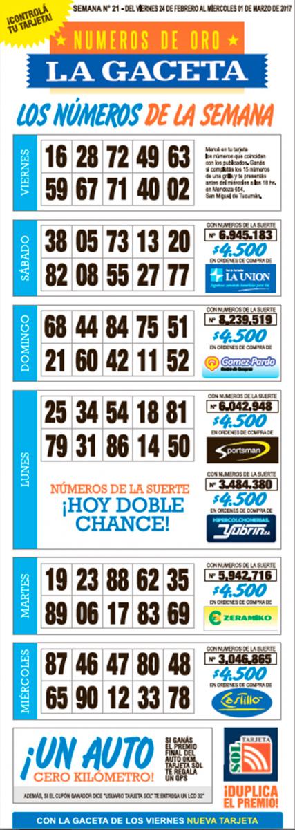 Como cada miércoles, se publicó la grilla completa de los Números de Oro de LA GACETA para que los lectores puedan revisar sus tarjetas. Aquellos que completen los 15 números de una de las grillas de su cartón deberán presentarse en calle Mendoza 654 hasta las 18, que cierra la semana número 21 de Números de Oro. En caso de que el ganador sea usuario Tarjeta Sol, duplica el premio.