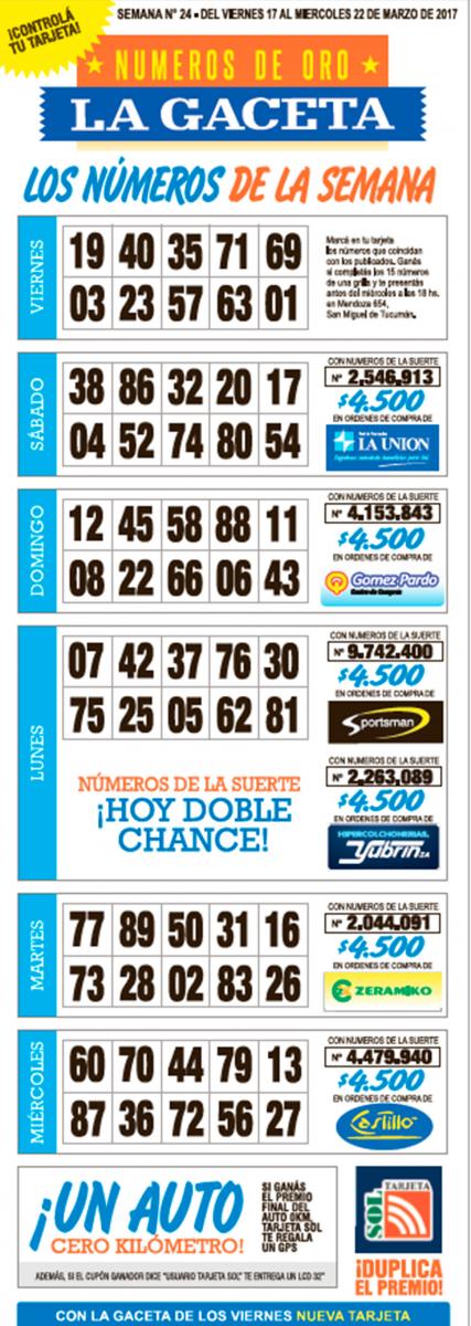 Como cada miércoles, se publicó la grilla completa de los Números de Oro de LA GACETA para que los lectores puedan revisar sus tarjetas. Aquellos que completen los 15 números de una de las grillas de su cartón deberán presentarse en calle Mendoza 654 hasta las 18, que cierra la semana número 24 de Números de Oro. En caso de que el ganador sea usuario Tarjeta Sol, duplica el premio.
