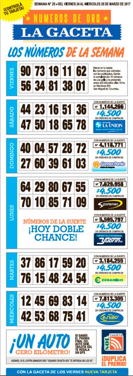 Como cada miércoles, se publicó la grilla completa de los Números de Oro de LA GACETA para que los lectores puedan revisar sus tarjetas. Aquellos que completen los 15 números de una de las grillas de su cartón deberán presentarse en calle Mendoza 654 hasta las 18, que cierra la semana número 25 de Números de Oro. En caso de que el ganador sea usuario Tarjeta Sol, duplica el premio. Esta semana el pozo acumulado es de $ 240.000.