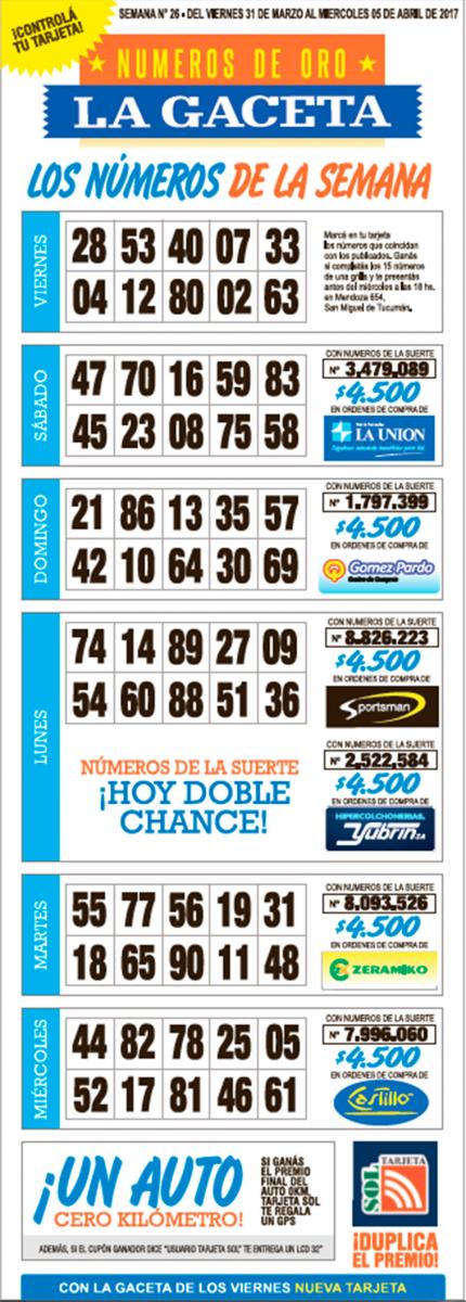 Como cada miércoles, se publicó la grilla completa de los Números de Oro de LA GACETA para que los lectores puedan revisar sus tarjetas. Aquellos que completen los 15 números de una de las grillas de su cartón deberán presentarse en calle Mendoza 654 hasta las 18, que cierra la semana número 26 de Números de Oro. En caso de que el ganador sea usuario Tarjeta Sol, duplica el premio. Esta semana el pozo acumulado es de $ 300.000.