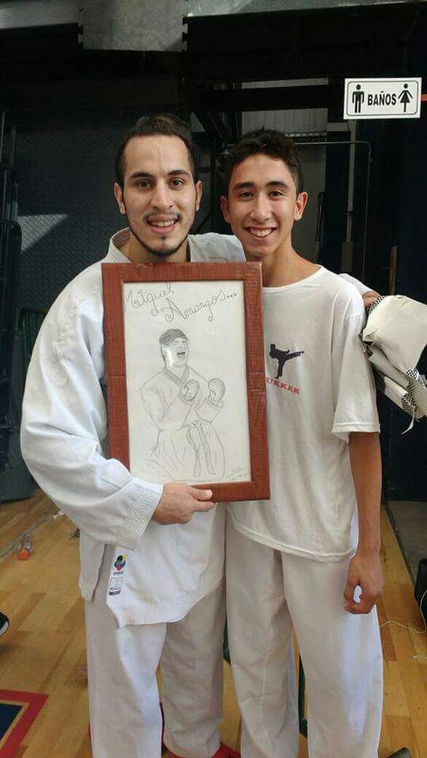 Miguel Amargós se fue del Open de Buenos Aires con la medalla dorada en el cuello y un obsequio en sus manos. “Estará colgado en mi pieza junto a otro que es muy importante para mí”, contó el karateca en alusión a la nota de LG Deportiva le hizo el 3 de agosto de 2015 cuando regresó a Tucumán tras conseguir el oro Panamericano en Toronto. El recorte del diario fue enmarcado y colgado en el cuarto de la vivienda donde reside en tierras bonaerenses. Y ahora se sumó otro: el dibujo que Gabriel Soplan le hizo a punta de lápiz. “Los dos me van a inspirar cada vez que me despierte”, contó. “Por primera vez, me regalan algo así”, comentó. “Lo sigo desde los 11 años”, contó el autor de la obra. Ahora, con 16, recuerda que en aquella Copa Atlántico, que se celebra cada año en Mar del Plata, empezó a admirarlo. “Miguel es un ejemplo a seguir. Quisiera ser como él y competir a nivel mundial”, reconoció el entrerriano que también compitió en Buenos Aires pero en la Copa Buenos Aires 2018.