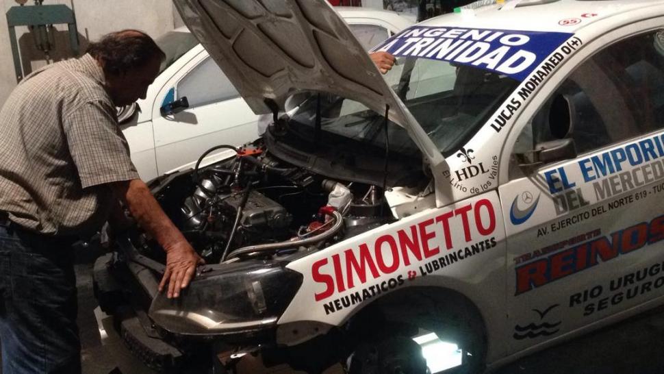 EN YERBA BUENA. En el taller del Mohamed Competición, “Lito” Mohamed revisa detalles del VW Gol Trend que su hijo Lucas acelerará desde el viernes. Prensa Mohamed Competición