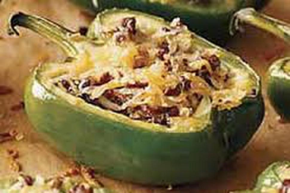 Preparación: Cortá los pimientos a lo largo en dos mitades cada uno; rehogá las cebollas y el ajo. Agregá el jamón crudo, el arroz, y salpimentá. Dejá enfriar y agregá el queso, mezclando bien, rellená los pimientos y llevá a horno caliente durante 25-30 minutos.