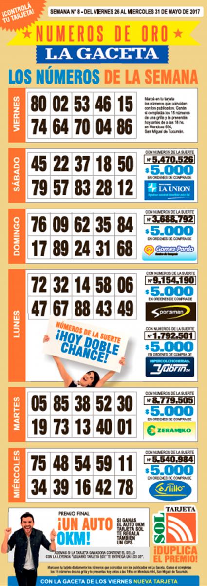 Como cada miércoles, se publicó la grilla completa de los Números de Oro de LA GACETA para que los lectores puedan revisar sus tarjetas. Aquellos que completen los 15 números de una de las grillas de su cartón deberán presentarse en calle Mendoza 654 hasta las 18, que cierra la semana número 8 de Números de Oro.