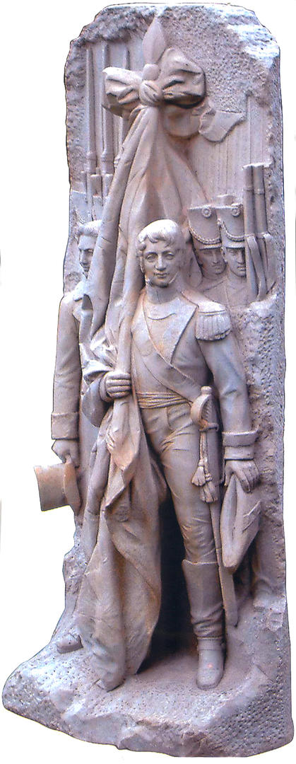 EL GENERAL BELGRANO. Aferrando la bandera que creó, en un mármol de la escultora tucumana Lola Mora.