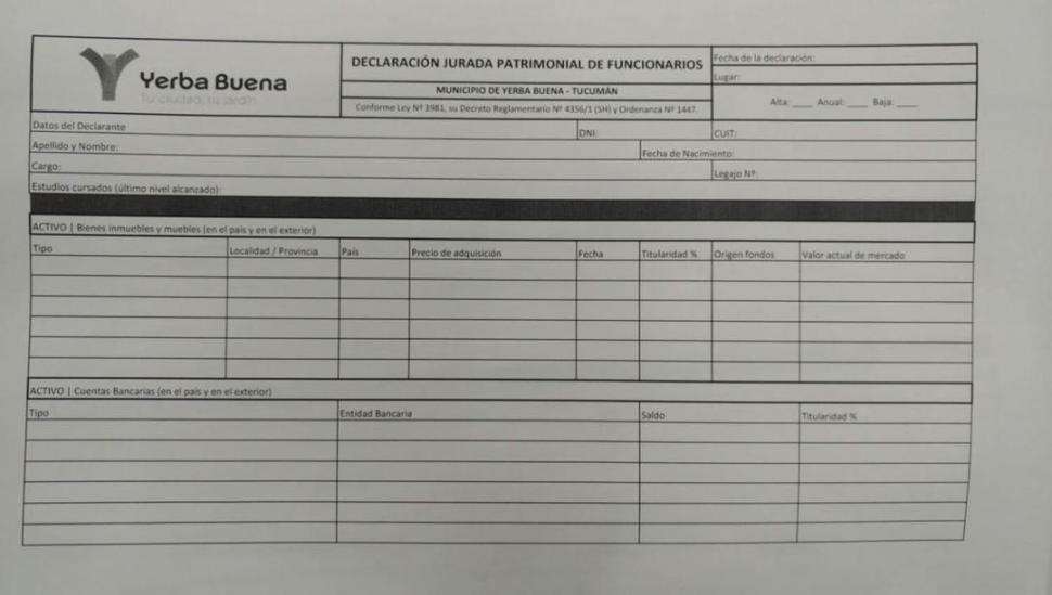 El documento que circula por los despachos de la intendencia ha sido elaborado por la Secretaría de Difusión y Gobierno Abierto local. Sus hacedores se han inspirado en otras planillas -de municipios de Buenos Aires, principalmente- y en el formulario que entrega la Oficina Anticorrupción de la Nación. (OA) ¿El resultado? Un documento en dos hojas de lado simple.