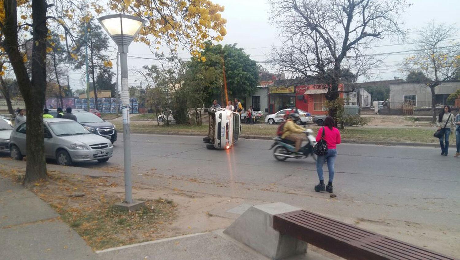 Según las primeras informaciones, el auto que volcó iba pasando por el lugar cuando fue chocado por otro que estaba estacionado y que justo en ese momento había comenzado a avanzar.