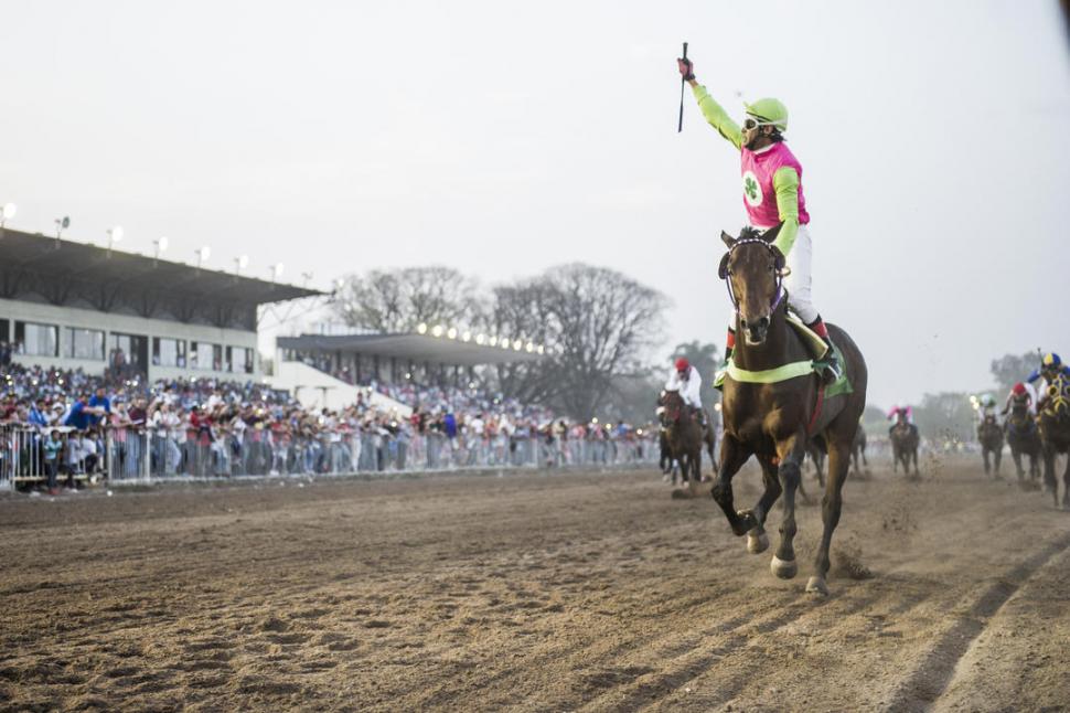 EXCESO DE TRANQUILIDAD. Sir Melody ya le sacó seis cuerpos al resto de los competidores y se apresta a cruzar el disco. El jockey Matías Basualdo saluda con el brazo derecho en alto, en señal de triunfo. la gaceta / FOTO DE JORGE OLMOS SGROSSO