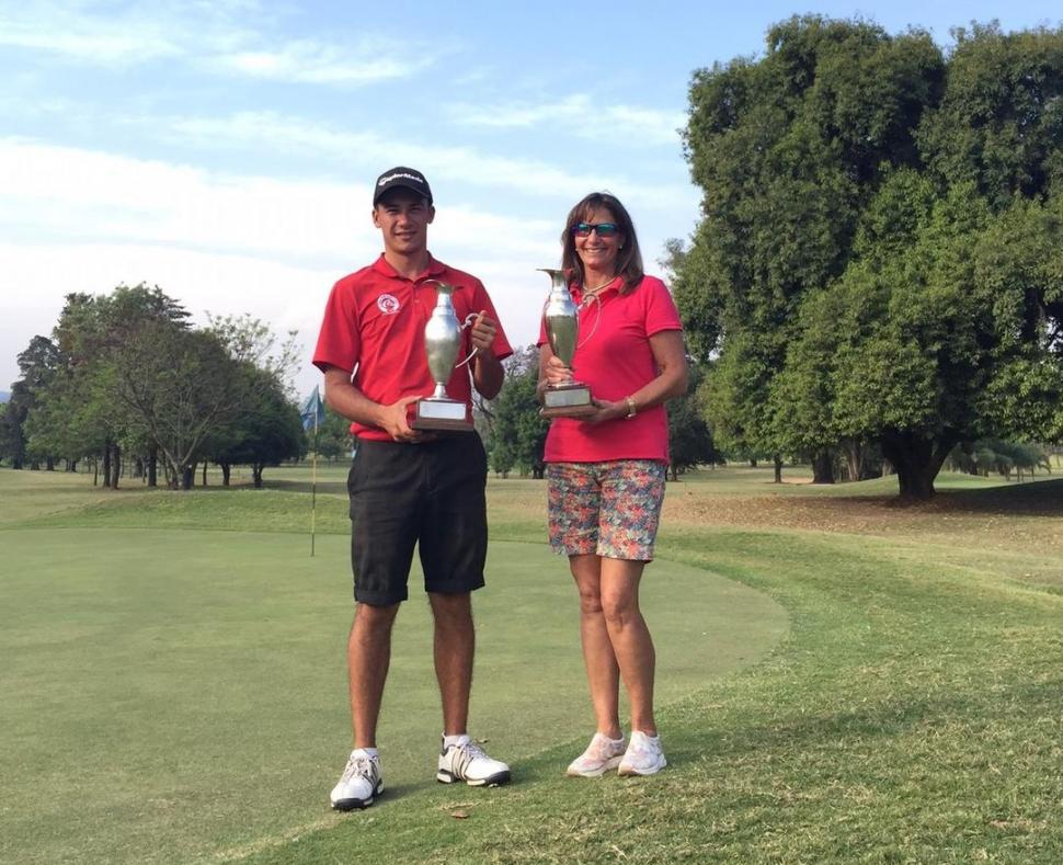 PREMIO MAYOR. Contini y Chavanne posan con sus respectivas jarras de plata, con el green del hoyo 9 como escenografía PRENSA JOCKEY CLUB