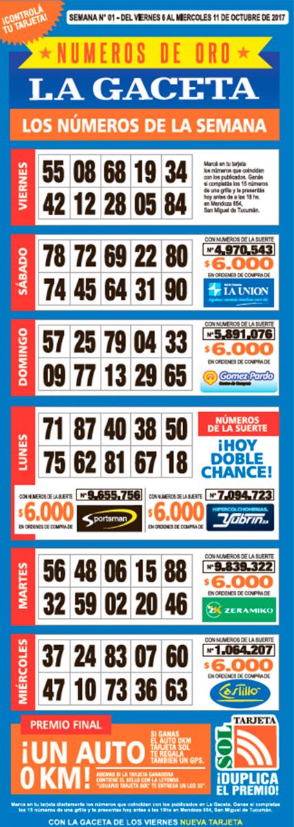 Como cada miércoles, se publicó la grilla completa de los Números de Oro de LA GACETA para que los lectores puedan revisar sus tarjetas. Aquellos que completen los 15 números de una de las grillas de su cartón deberán presentarse en calle Mendoza 654 hasta las 18, que cierra la semana número 1 de Números de Oro. En caso de que el ganador sea usuario Tarjeta Sol, duplica el premio.