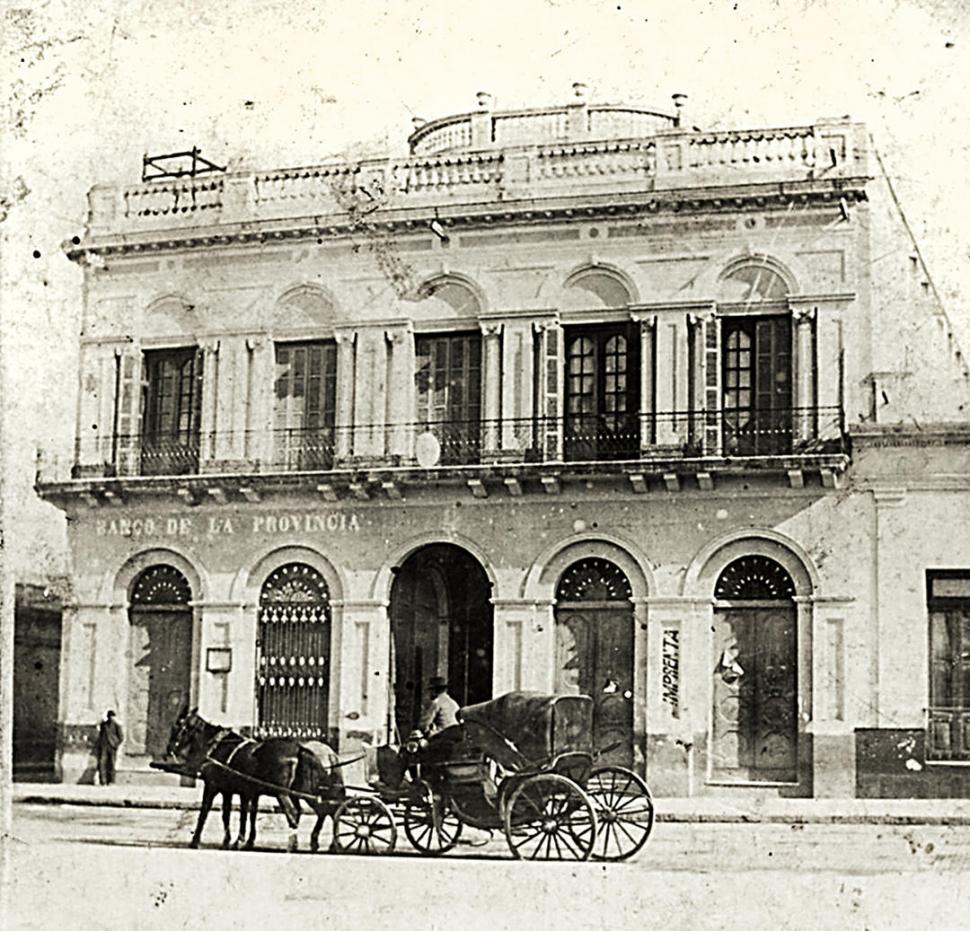 A FINES DEL XIX. Un coche de caballos frente al caserón Juan Manuel Méndez, de 25 de Mayo esquina 9 de Julio, en cuyos bajos funcionaba el Banco de la Provincia.