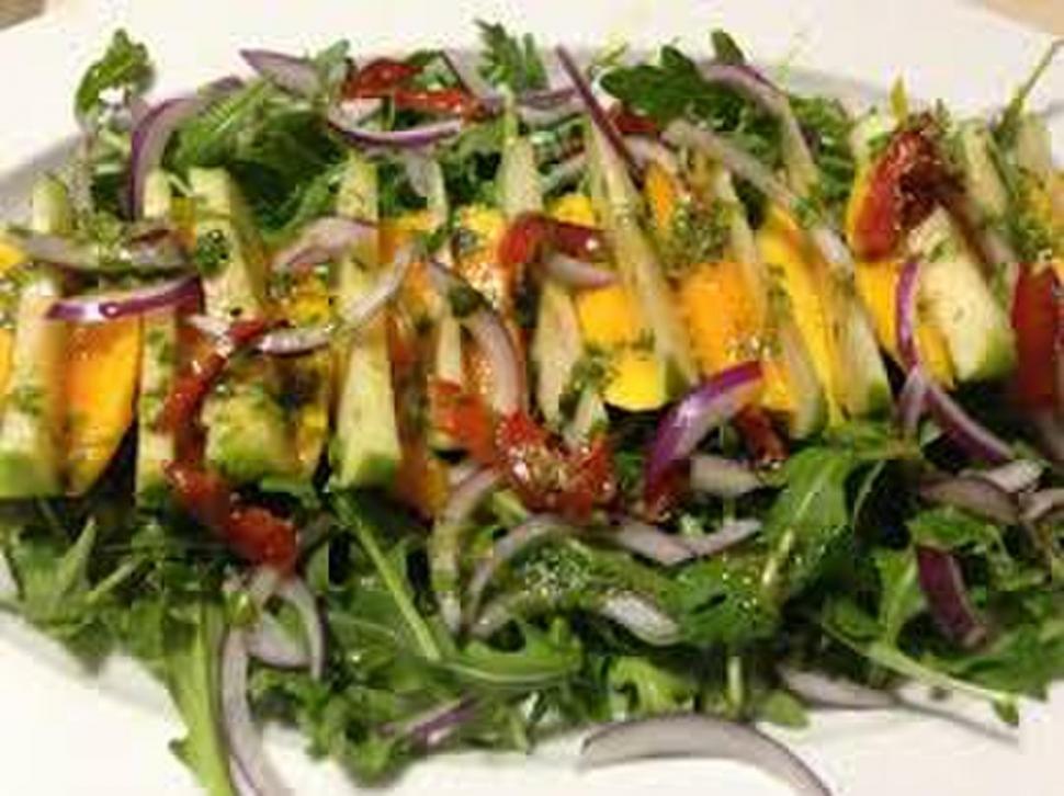Preparación: colocá las verduras en una ensaladera. Prepará la vinagreta mezclando vigorosamente en un bol chico el aceite, sal, pimienta, aceto y rociá la ensalada. Serví con jugos naturales de frutas.
