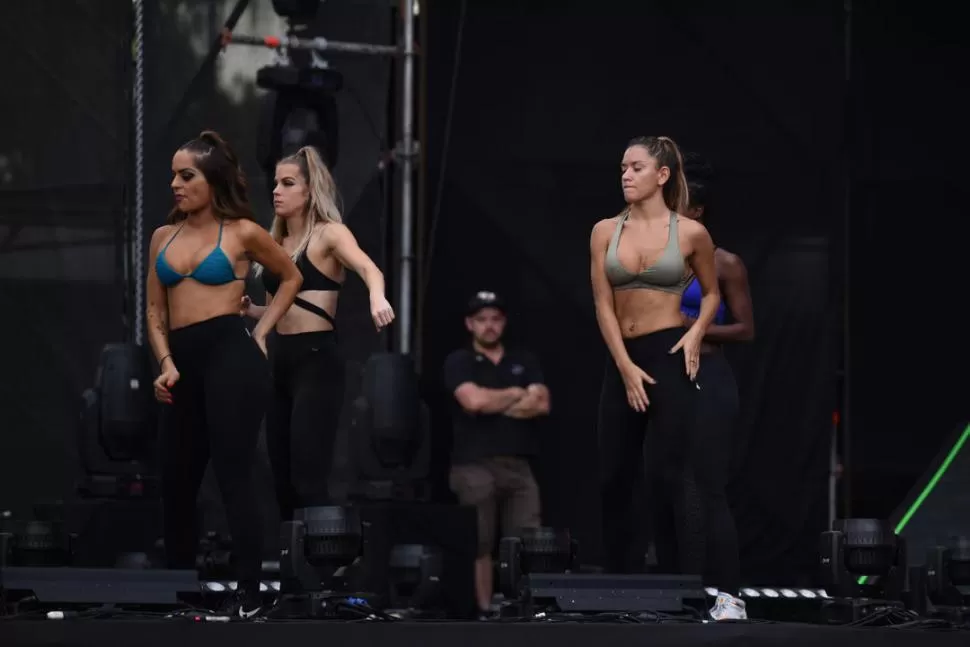 Si se habla de temperatura, se habla de las bailarinas que acompañan al cantante durante el espectáculo potente y sensual. Con tops, corpiños deportivos y calzas se subieron al escenario para activar la musculatura y ensayar las coreografías de la noche. Algunas bailarinas utilizaron las gradas de Central Córdoba para trotar y entrar en calor.
