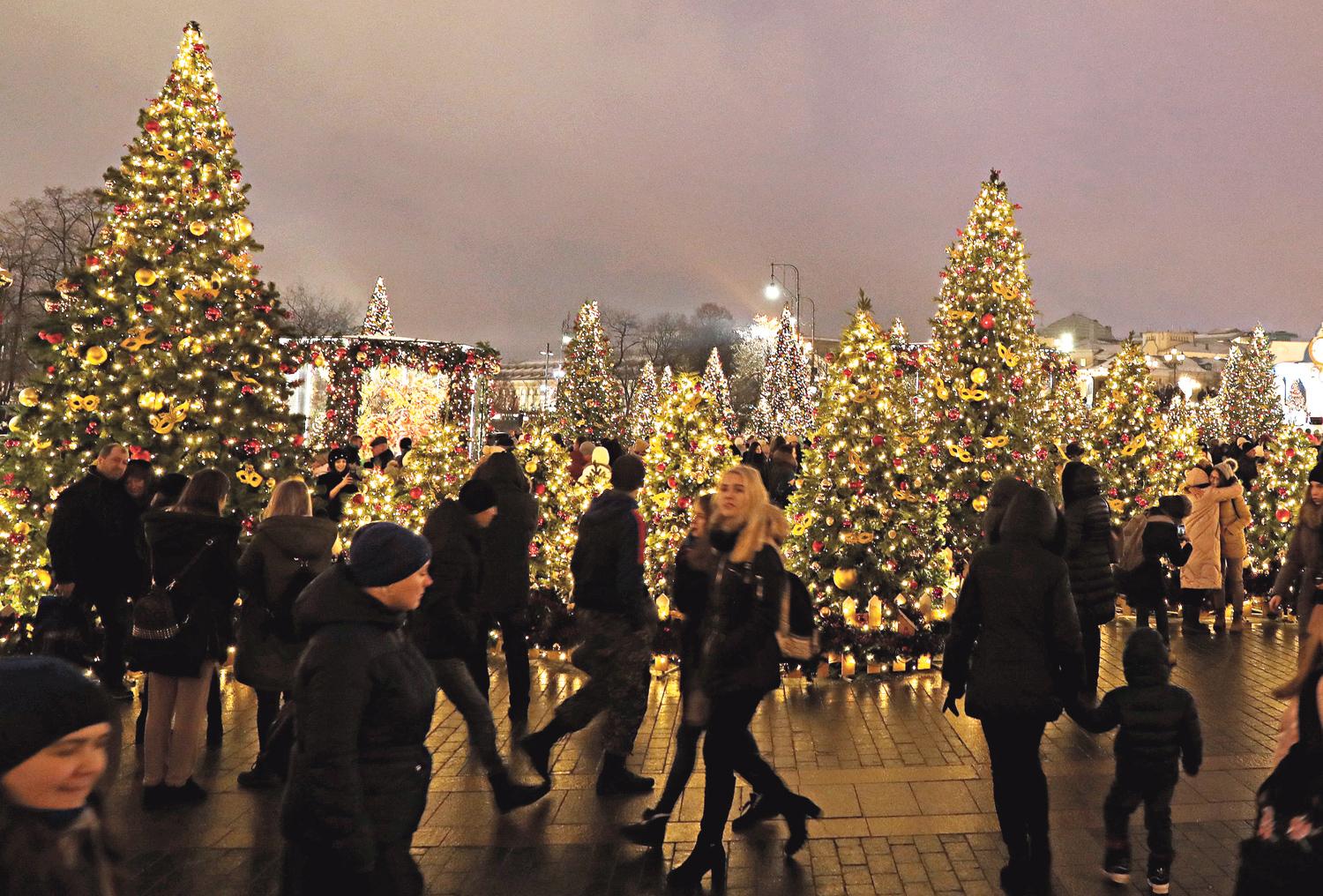La gente camina abrigada por la calle decorada con árboles de Navidad y luces de colores antes de las fiestas de Navidad y de Año Nuevo, en el centro de Moscú. (Foto principal)