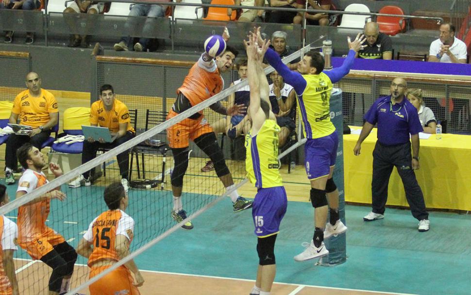 DIFÍCIL. Brian Melgarejo se topa con el firme bloqueo de Upcn que fue superior. foto de monteros voley club