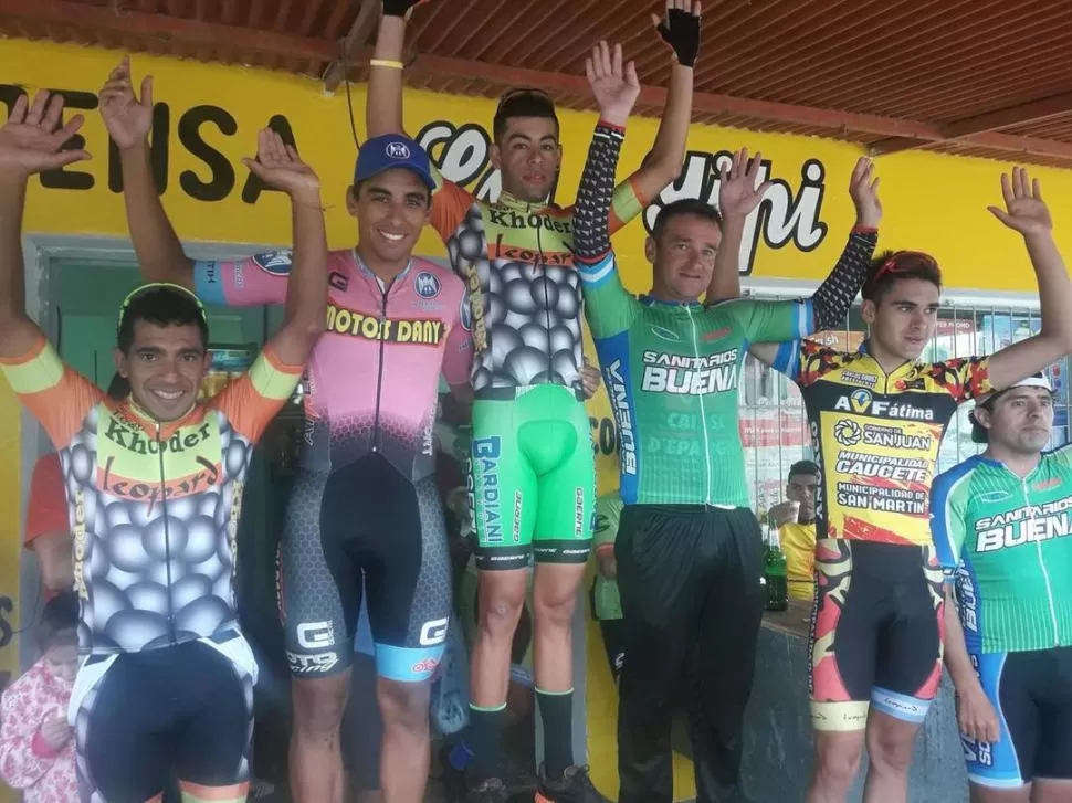 Zacarías Khoder -en el centro de la foto- se impuso en la competencia interprovincial de ciclismo que se corrió en la vecina provincia de Santiago del Estero.