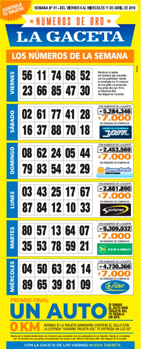 Como cada miércoles, se publicó la grilla completa de los Números de Oro de LA GACETA para que los lectores puedan revisar sus tarjetas. Aquellos que completen los 15 números de una de las grillas de su cartón deberán presentarse en calle Mendoza 654 hasta las 18. En caso de que el ganador sea usuario Tarjeta Sol, duplica el premio.