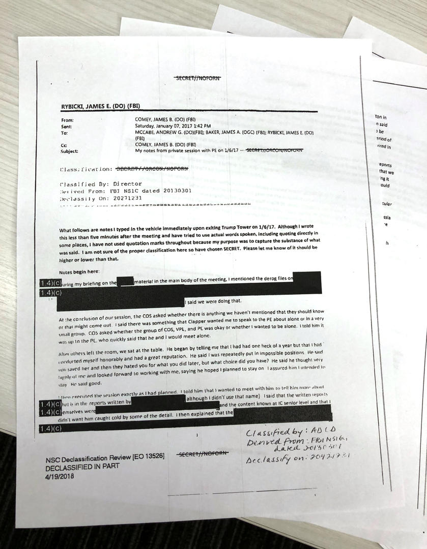 Los textos, parcialmente censurados, fueron entregados por el Departamento de Justicia de Estados Unidos a tres comisiones de la Cámara de Representantes. Las 15 páginas contienen detalles sobre una serie de reuniones que Comey encontró tan desconcertantes que decidió documentarlas.