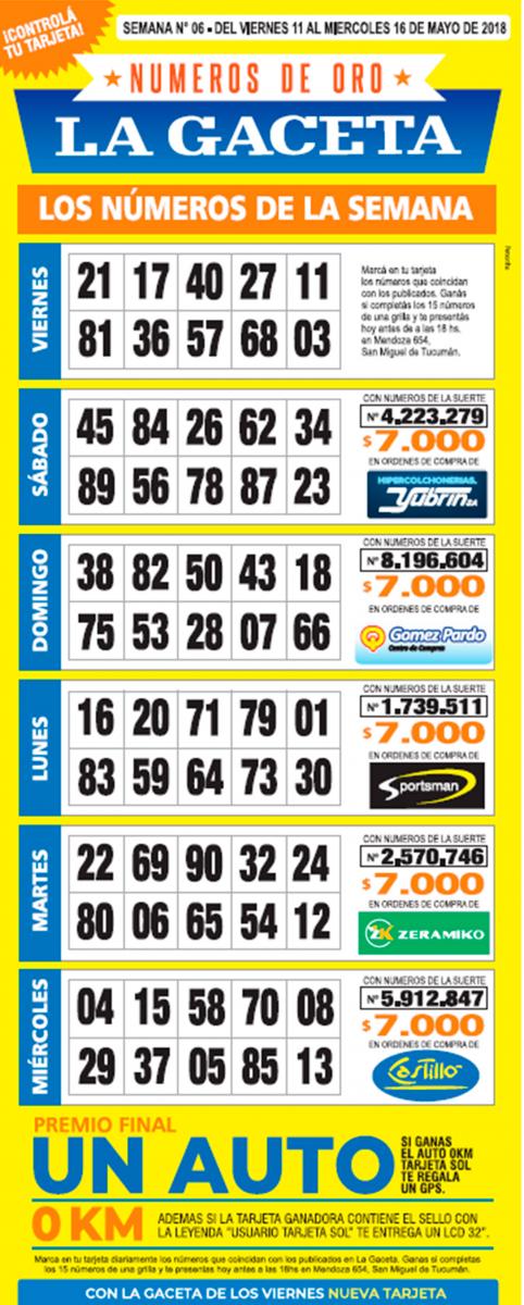 Como cada miércoles, se publicó la grilla completa de los Números de Oro de LA GACETA para que los lectores puedan revisar sus tarjetas. Aquellos que completen los 15 números de una de las grillas de su cartón deberán presentarse en calle Mendoza 654 hasta las 18. En caso de que el ganador sea usuario Tarjeta Sol, duplica el premio.