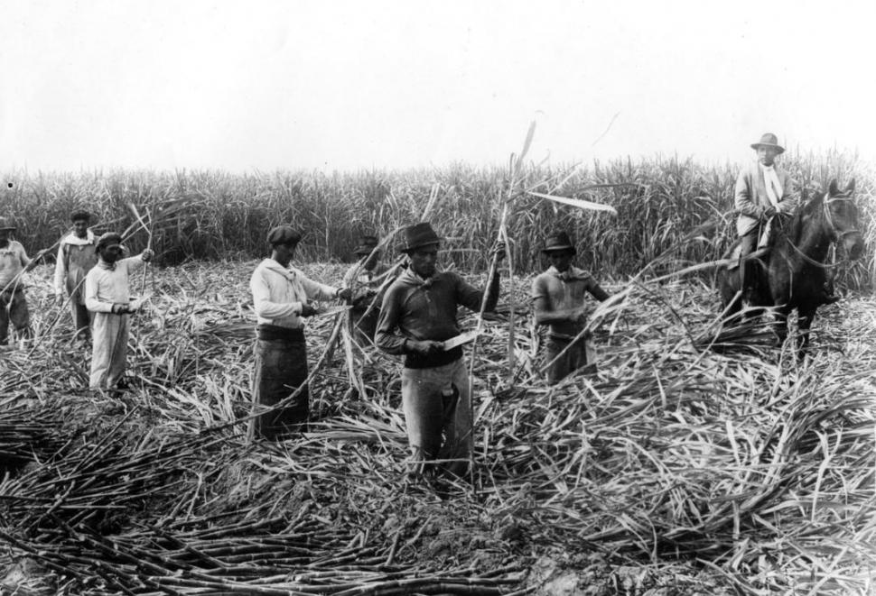 A MACHETE LIMPIO. Grupo de obreros cosechando caña, en una fotografía de los años 1920.