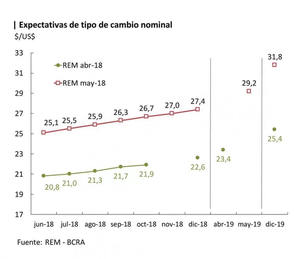Al cierre del anterior Relevamiento de Expectativas de Mercado (REM), difundido por el Central, el nivel de tipo de cambio nominal mayorista promedio mensual se ubicaba en $ 20,20 por dólar. Sin embargo, el de mayo promedió los $ 23,70 tras la depreciación nominal del peso respecto del resto de las monedas. Las expectativas sobre esta variable se corrigieron al alza para todos los períodos relevados respecto de la encuesta previa. Para fines de este año, los analistas consultados por el BCRA proyectan que el tipo de cambio nominal alcanzaría $ 27,40 promedio mensual, un 54,7% más interanual (ver infograma).