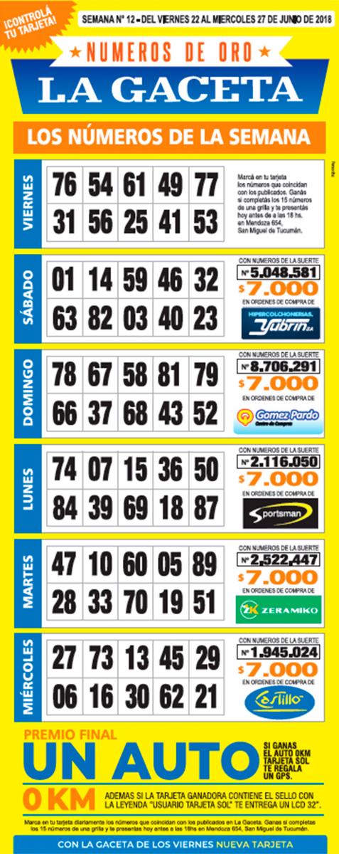 Como cada miércoles, se publicó la grilla completa de los Números de Oro de LA GACETA para que los lectores puedan revisar sus tarjetas. Aquellos que completen los 15 números de una de las grillas de su cartón deberán presentarse en calle Mendoza 654 hasta las 18. En caso de que el ganador sea usuario Tarjeta Sol, duplica el premio. ¡El pozo acumulado es de $ 770.000!