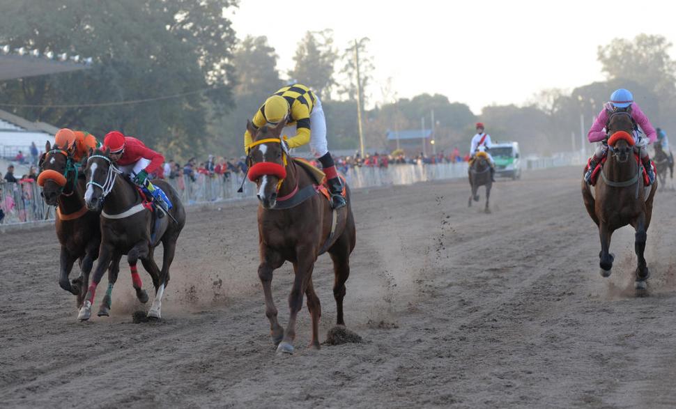 RUMBO A LA VICTORIA. Binary Code ya dejó atrás a sus rivales y va en busca de la victoria en la prueba principal que se corrió ayer en el hipódromo tucumano. LA GACETA / FOTO DE ANTONIO FERRONI