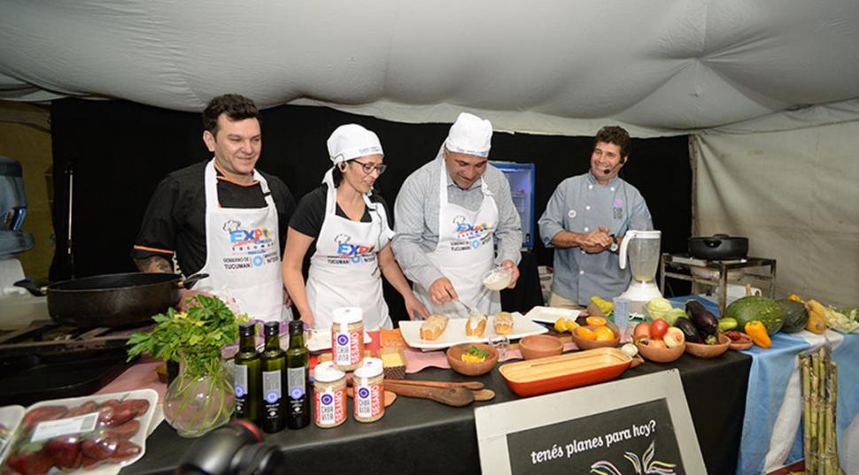 DEGUSTACIÓN. El gobernador Manzur comparte la elaboración de un plato con cocineros tucumanos en un stand. comunicación pública