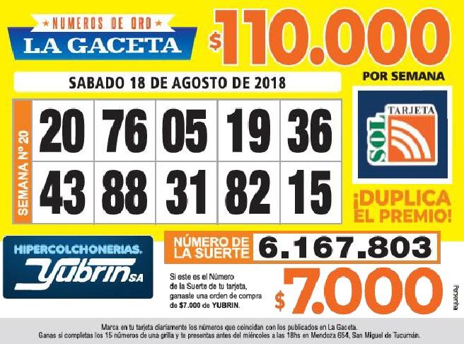 Los Números de Oro de LA GACETA del 20 de febrero de 2026