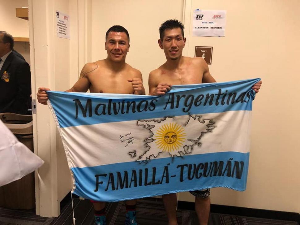 El “Zorrito” de Famaillá, en un combate emocionante, y con un final no apto para cardíacos, mandó a la lona en el último round a su rival, con un recto de derecha. Pero el árbitro Rudy Barragán le regaló unos segundos importantes para recuperarse. El oriental aguantó el castigo y terminó de pie. Luego los jurados dieron su veredicto. Pat Russell y Fernando Villarreal, a favor de Okada por 95 a 94; Daniel Sandoval, se inclinó por Coria por el mismo puntaje. Al final, ambos posaron con la bandera argentina -foto-. (Especial)