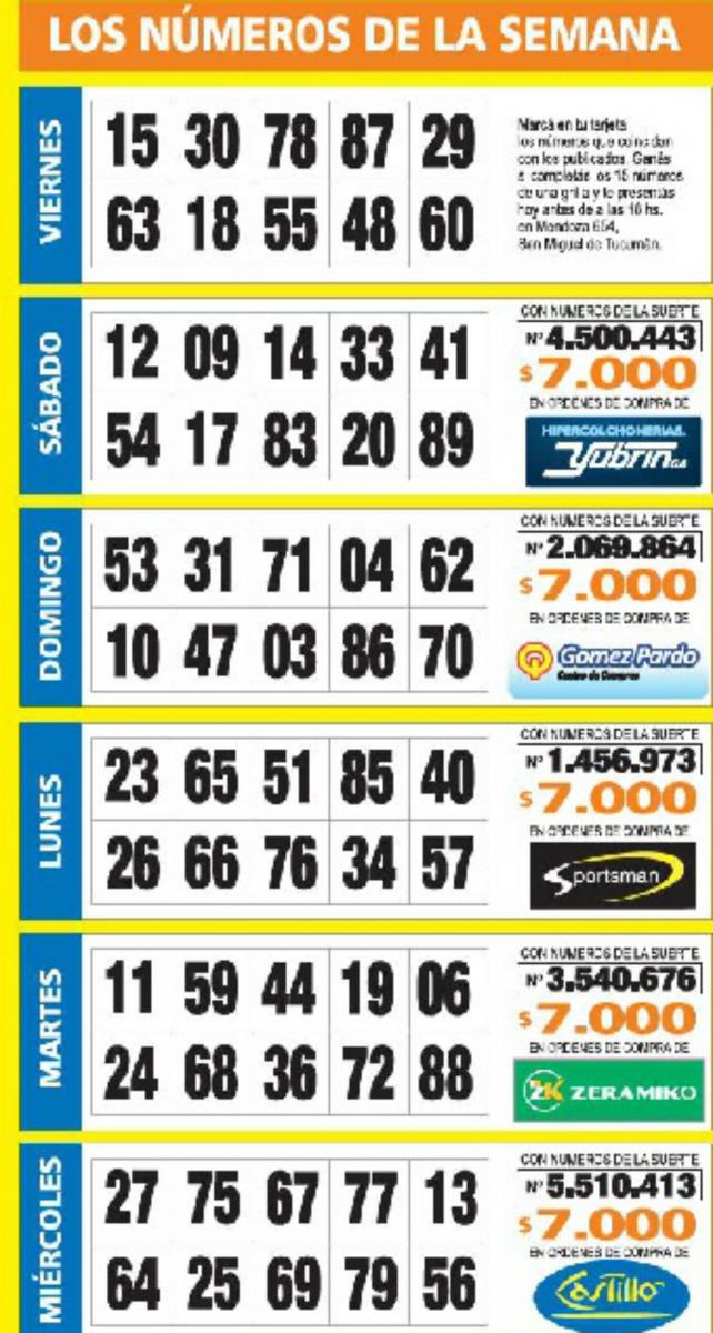 Como cada miércoles se publicó la grilla completa de los Números de Oro de LA GACETA para que los lectores puedan revisar sus tarjetas. Aquellos que completen los 15 números de una de las grillas de su cartón deberán presentarse en calle Mendoza 654 hasta las 18. En caso de que el ganador sea usuario Tarjeta Sol, duplica el premio.