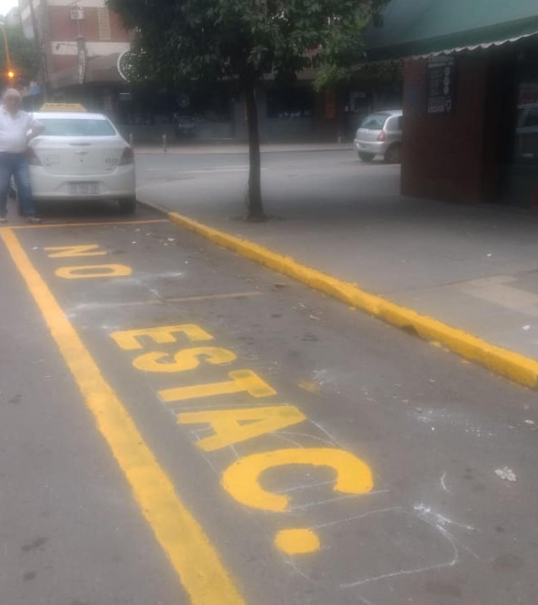 "No estacionar", así dice el cartel que pintaron con amarillo en la entrada de un garage ubicado en Buenos Aires al 600, en donde habían puesto una parada de taxis.